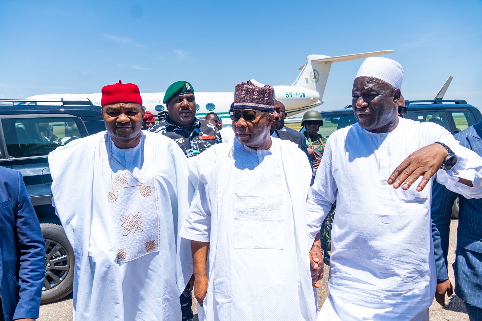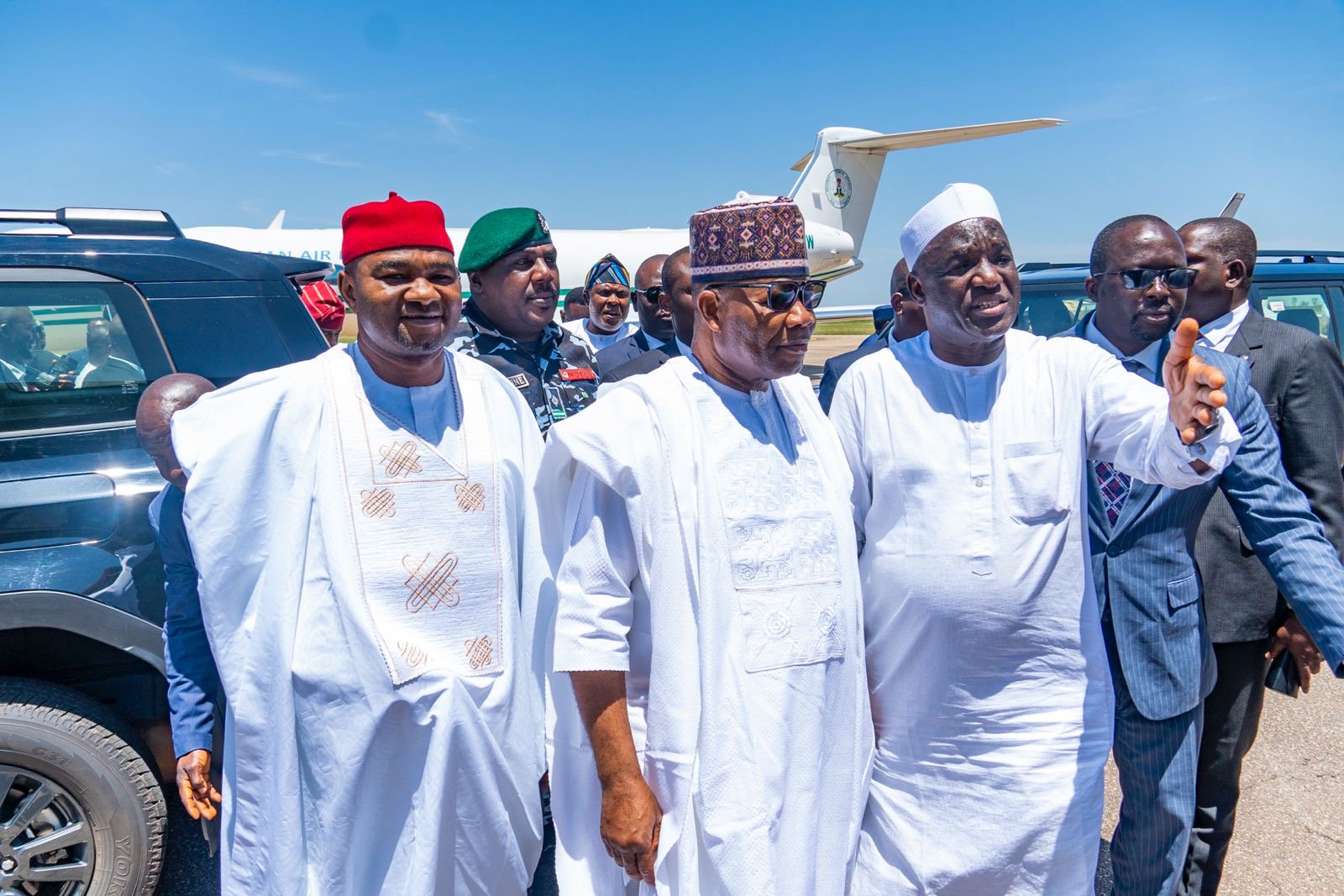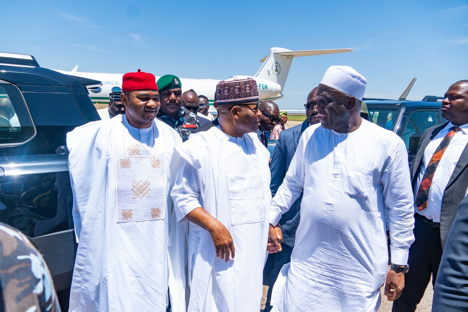 Shortly after their Arrival, the President of the Federal Republic of Nigeria, His Excellency President Bola Ahmed Tinubu, arrived at the Yakubu Gowon Airport amid his delegation into the state.